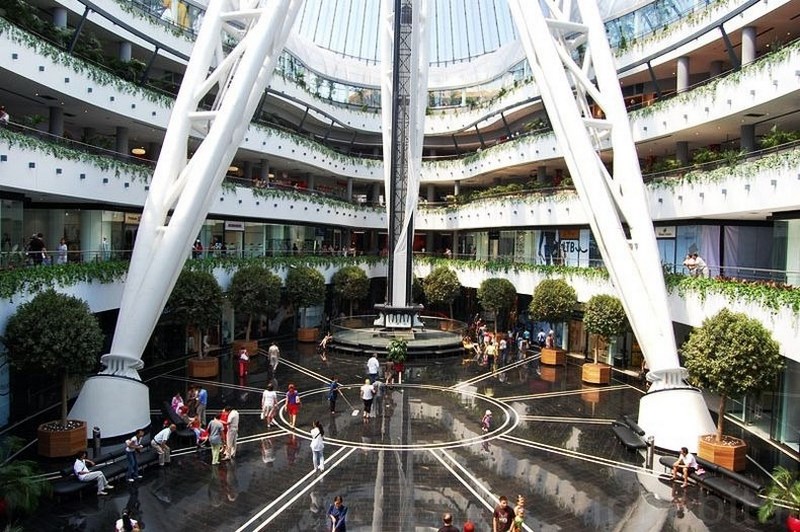 Торговые галереи комплекса на пяти уровнях концентрическими кругами неправильной формы расходятся от центрального атриума и не соприкасаются с внешними стенами. Складывается ощущение, что они парят в воздухе. Ощущение усиливает полупрозрачное покрытие стен, фееричным образом подсвечиваемое в ночное время.