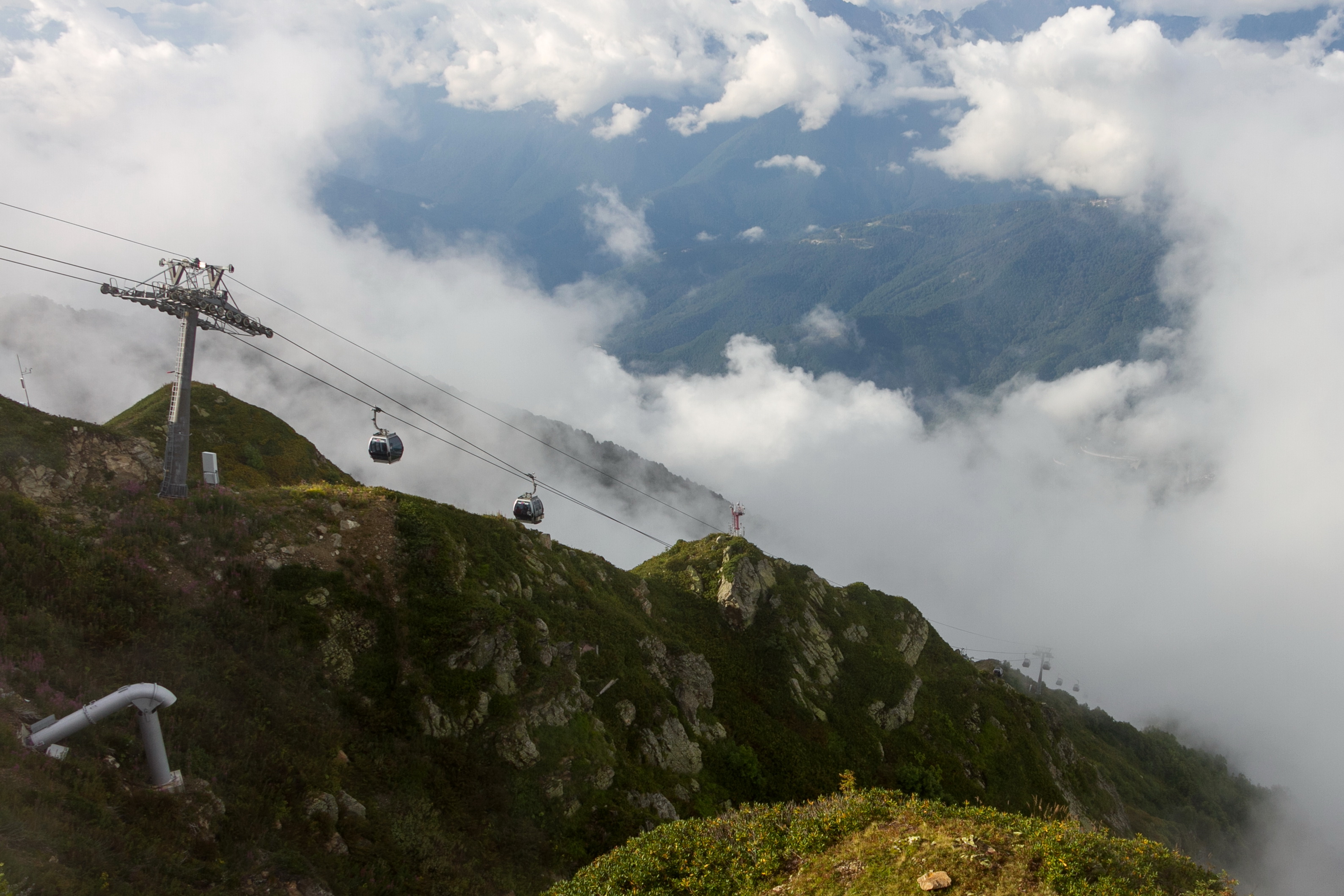 Подняться на вершины горного массива можно при помощи канатной дороги из «Розы Хутор», а можно самостоятельно – пешком. Горы Аибги – это место, где встречаются две страны. Пройдя по подвесному мосту, турист окажется в точке, из которой с одной стороны видна Россия, а с другой – территории Республики Абхазия. Получается такое своеобразное путешествие с видом на две страны.
